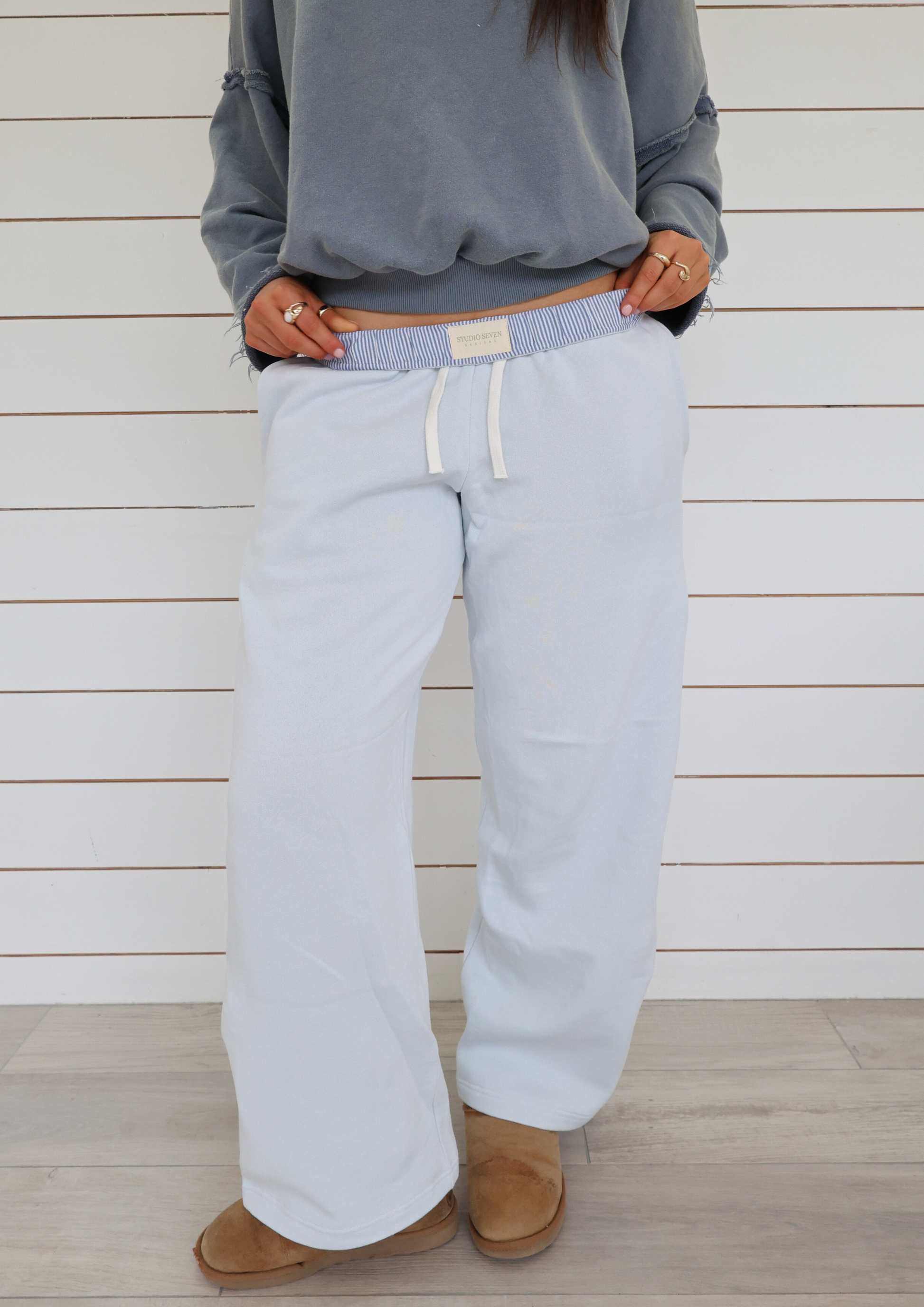 Le pantalon de jogging Georgia est doté d'une ceinture réversible qui vous permet de passer du bleu marine classique à une rayure bleu pâle et blanche. Deux looks en un, selon vos envies. L'intérieur est incroyablement douillet sur la peau, le genre de confort que vous rechercherez encore et encore. Orné d'une étoile brodée sur la poche arrière pour la petite touche Studio Seven, il allie parfaitement détails soignés et praticité au quotidien.
